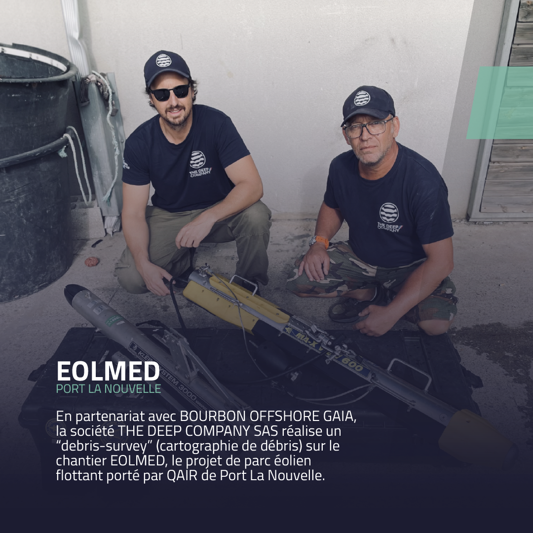 En partenariat avec BOURBON OFFSHORE GAIA, la société THE DEEP COMPANY SAS réalise un « debris-survey » (cartographie de débris) sur le chantier EOLMED de Port La Nouvelle.