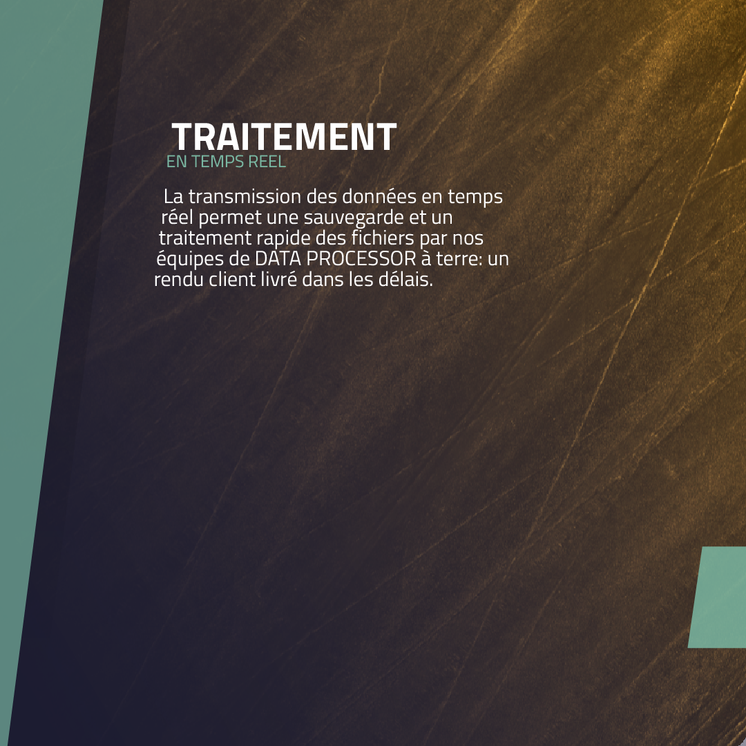La transmission des données en temps réel permet une sauvegarde et un traitement rapide des fichiers par nos équipes de DATA PROCESSOR à terre: un rendu client livré dans les délais.