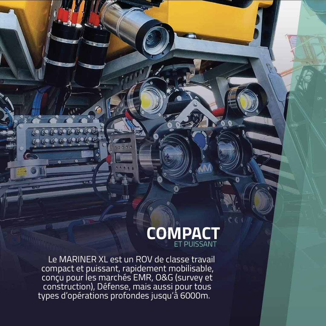 Le MARINER XL est un ROV de classe travail compact et puissant, rapidement mobilisable, conçu pour les marchés EMR, O&G (survey et construction), Défense, mais aussi pour tous types d’opérations profondes jusqu’à 6000m.